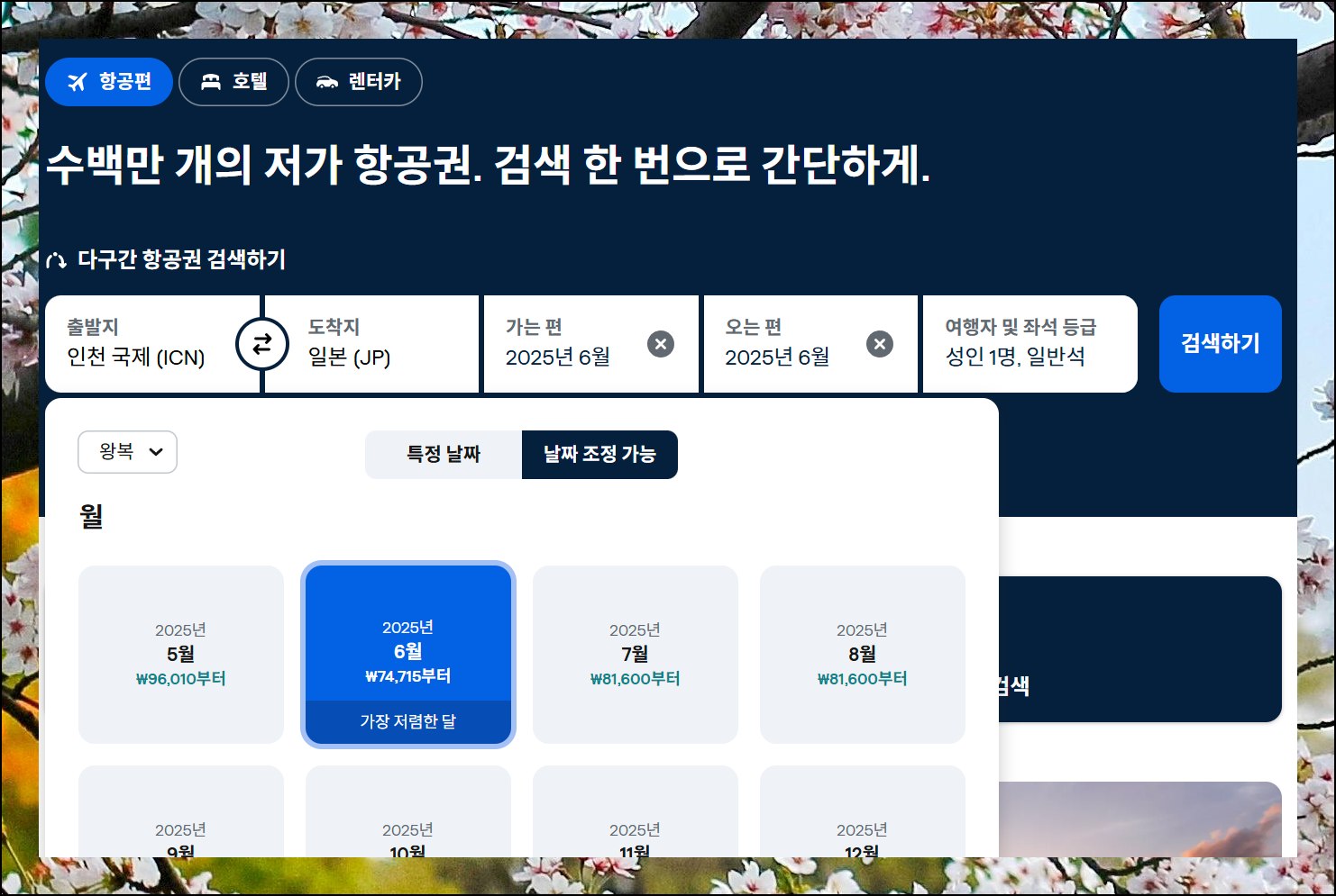 가까운 거리 여행에서는 '직항만' 옵션을 체크하고 한 달 단위로 날짜 범위를 설정해보세요. 이런 방식으로 검색하면 해외여행 목적지 중에서 가장 경제적인 도시를 선택하는 데 도움이 됩니다.