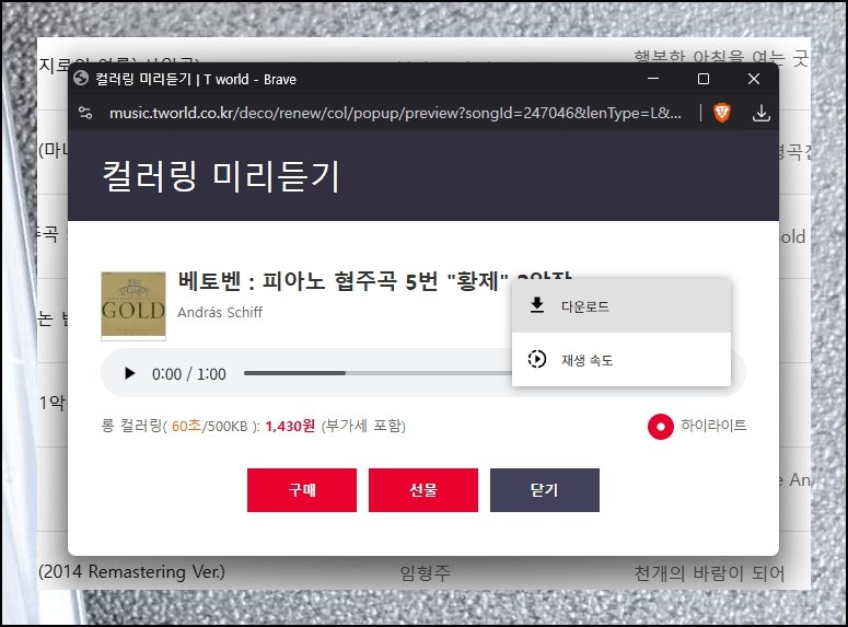 궁금한 핸드폰 컬러링 음원이 있으면 골라서 곧바로 틀어볼 수 있어요. 결제 전에 소리를 미리 체크하는 용도로 안성맞춤입니다. 다운로드 버튼을 누르면 오디오 파일로 간단히 받아둘 수 있어요. 한번 저장해놓으면 생각날 때마다 편하게 꺼내 들을 수 있습니다.