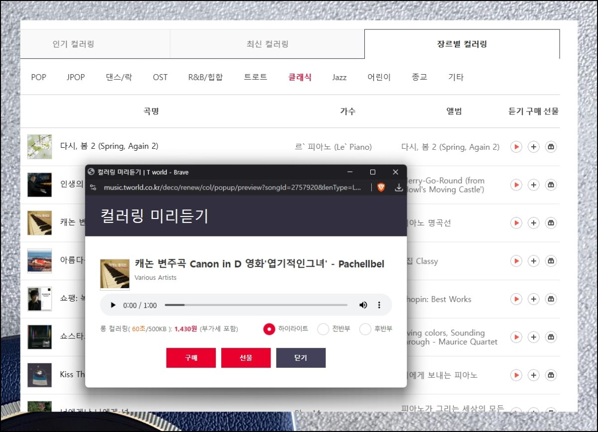 클래식 카테고리에서 반응이 좋은 핸드폰 컬러링 곡을 하나 눌러봤어요. 재생 아이콘을 탭하자 미리듣기 팝업이 열렸습니다. 플레이를 한 차례 더 누르면 무료로 소리를 확인해볼 수 있어요. 음원 자체를 다운로드하고 싶다면 재생바 맨 끝에 보이는 점 세 개 표시를 탭해보세요.