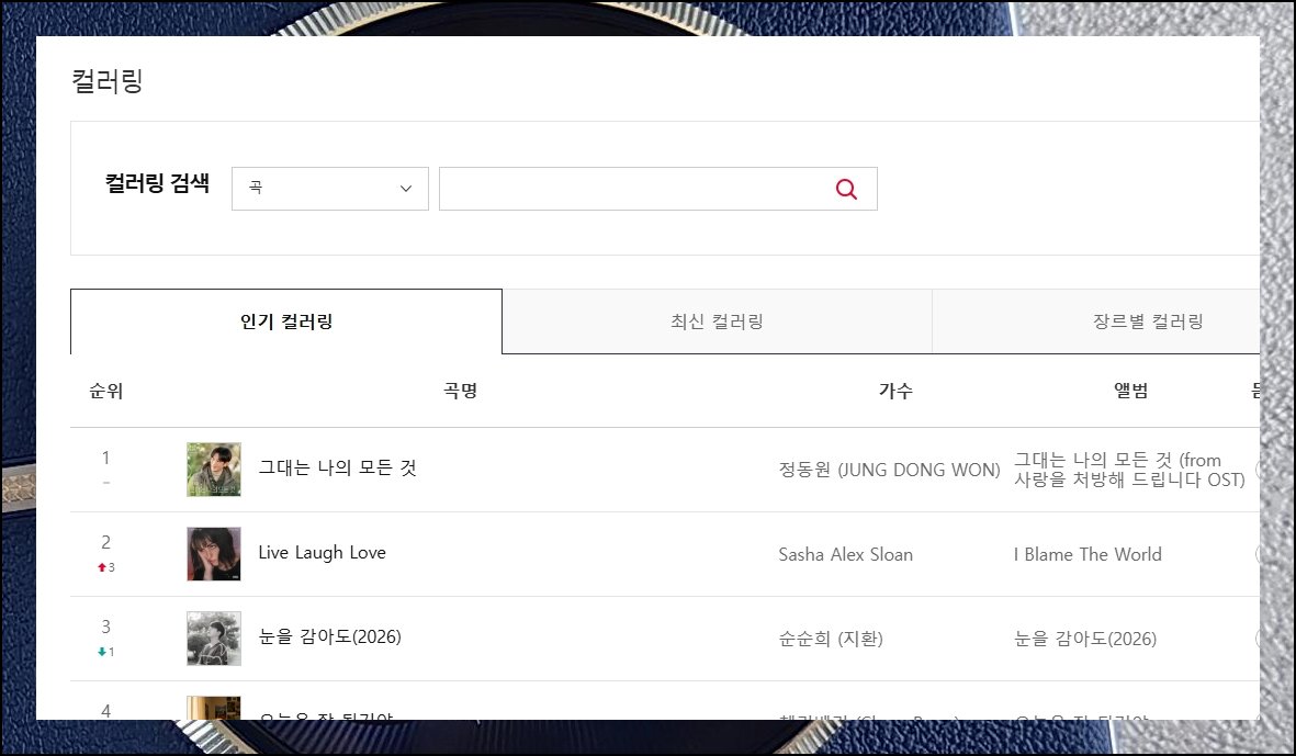 페이지가 전환되면 듣고 싶은 곡을 직접 탐색할 수 있습니다. 곡명이나 아티스트, 앨범 타이틀 세 가지 키워드로 조회가 가능해요. 조회창 하단에는 트렌드곡, 최신곡, 장르별 순위가 모아져 있으니 느긋하게 골라보세요.