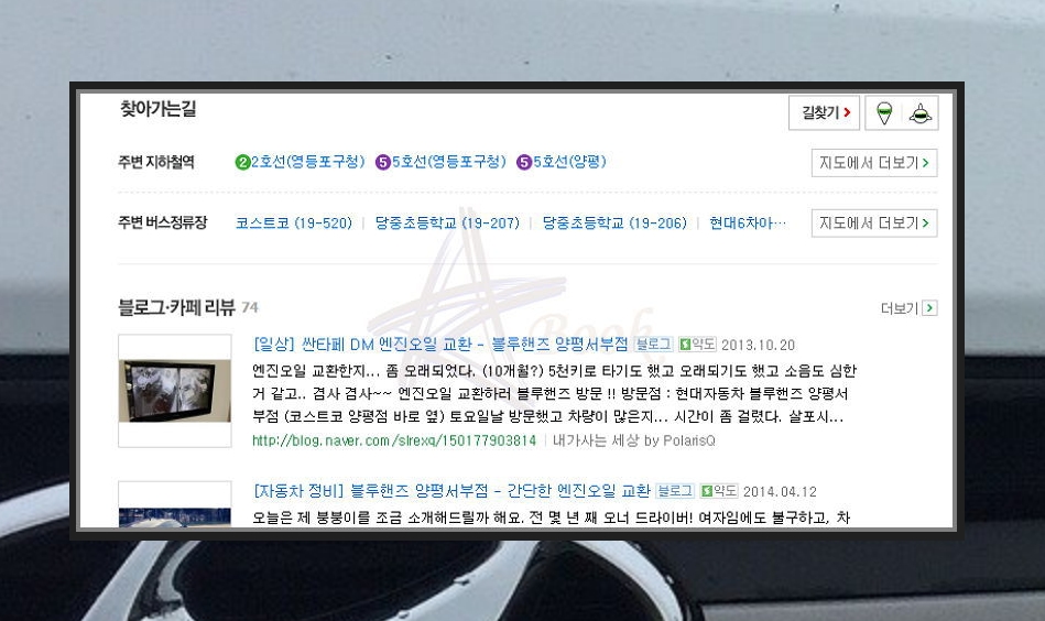 제가 알려드린 방법으로 영업시간 외에 다른 정보도 얻을 수 있습니다. 현대자동차 블루핸즈의 양평서부장, 경서모터스, 오토바디모터스 등의 지점명을 클릭해보세요. 그럼 찾아가는 방법과 후기를 알아볼 수 있습니다. 엔진오일 교환했는데 수리 및 점검받을 차량이 많아서 시간이 좀 걸렸다는 이야기가 있네요.