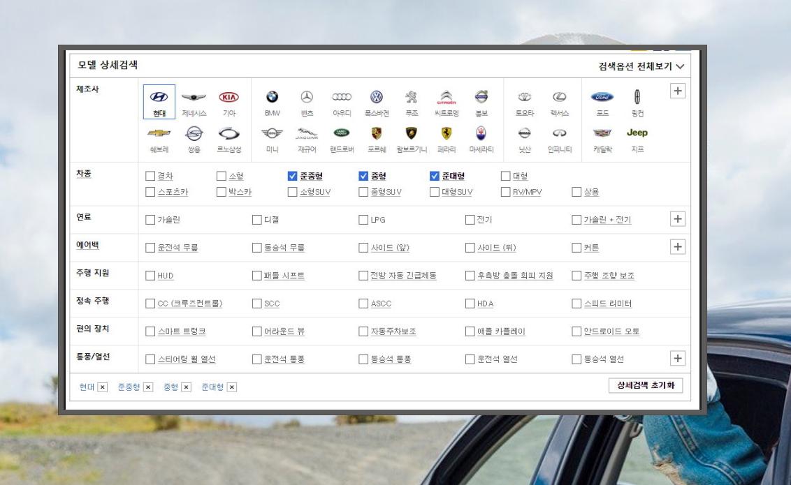 모든 현대자동차를 구매하시려는 것은 아니겠죠? 원하는 차동, 연료, 주행 지원 장치 등이 있을 겁니다. 제조사를 현대로 하나씩 지정해 주세요. 저는 많은 분들이 선호하는 준중형, 중형, 준대형 차종을 체크하였습니다.