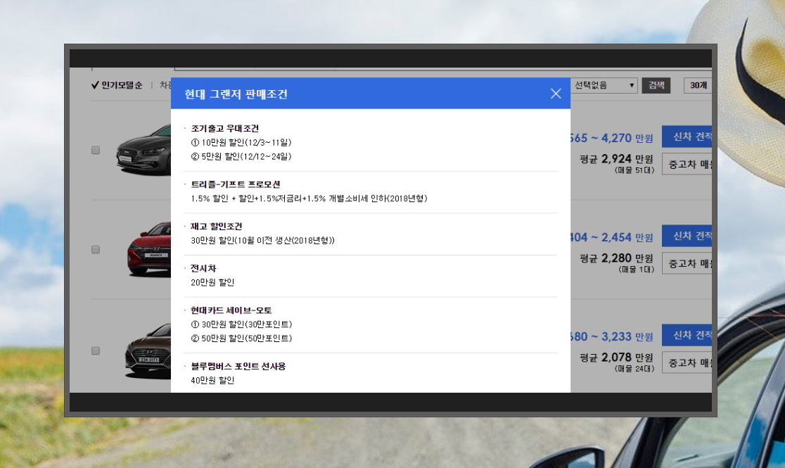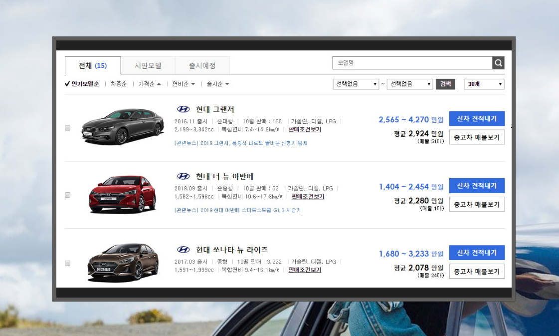 제가 체크한 대로 결과가 나왔는데요. 가장 인기가 많은 모델은 현대 그랜져네요. 옆에 보시면 신차 판매가가 2,565~4270 만원이라고 적혀 있죠? 왜 이렇게 나오냐면요. 같은 차량이라도 등급이나 옵션에 따라 최종 구매 금액이 달라지기 때문이랍니다. 그렇기 때문에 자신이 원하는 옵션을 아셔야 해요. 그래야 정확한 가격표를 확인하실 수 있어요.