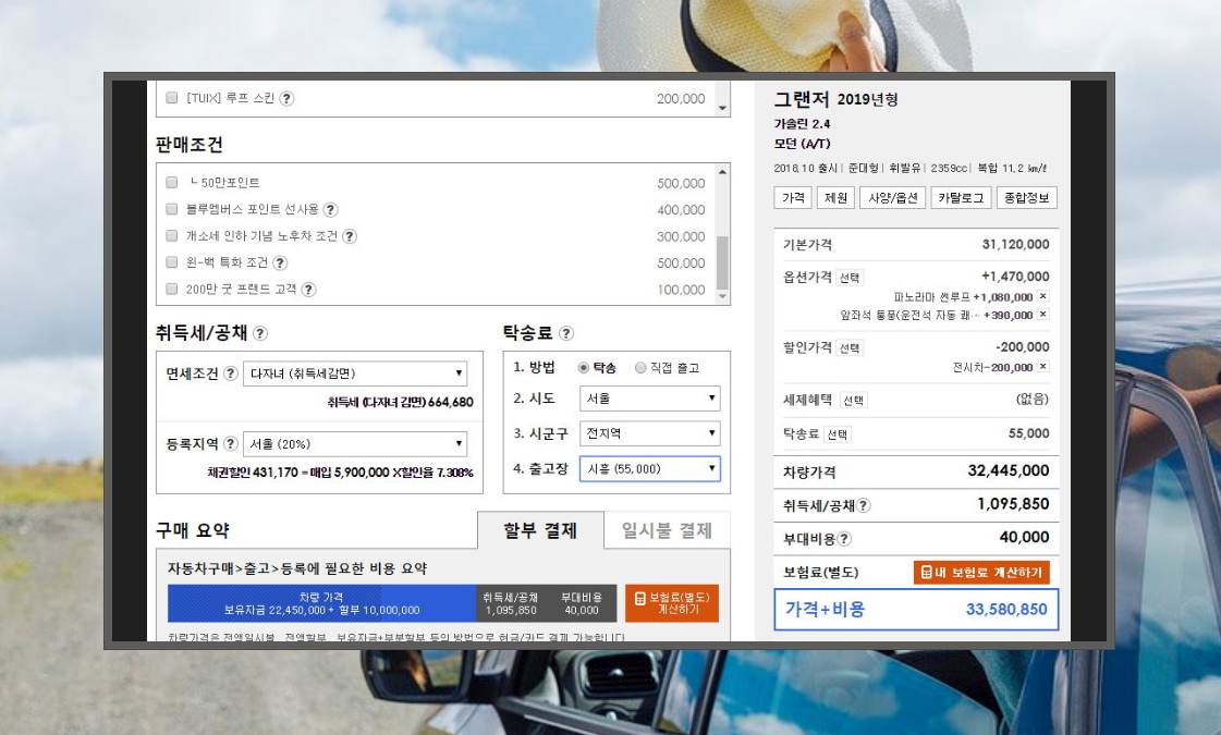세부모델과 옵션을 정하셨다면 자신이 받을 수 있는 판매조건을 선택해 주세요. 최대한 저렴하게 살 수 있도록 꼼꼼히 알아보세요. 이제 다 끝났지만, 현대자동차 신차를 구매할 때 들어가는 비용은 이게 전부는 아닙니다. 관련 세금과 탁송료가 추가되어야 하죠. 취득세와 공채, 탁송료까지 지정하면 신차가격표에서 총 비용을 확인하실 수 있습니다.