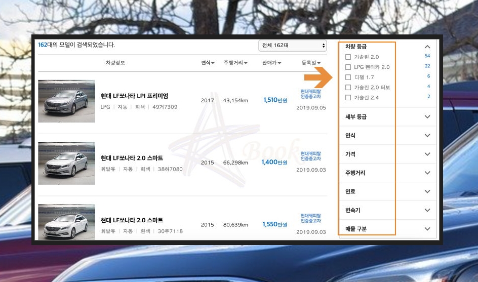 매물이 많고, 많은 분들이 선호하는 모델인 LF쏘나타를 가지고 현대자동차 중고차가격표를 확인해 보도록 하겠습니다. 사람마다 차량 구매 시 중요하게 여기는 기준이 제각각인데요. 본인이 원하는 세부 등급, 연식, 금액, 주행거리, 연료, 변속기 등을 지정해 주세요.