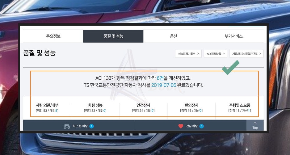 품질과 성능을 통해 차량 외관 및 내부, 차량 성능, 안전장치, 주행 및 소모품, 편의장치에 대한 점검된 항목과 개선된 항목을 확인하실 수 있습니다. 가격표에 나와 있듯이 성능점검 기록부, aqi 점검항목, 자동차기능 종합진단표 확인도 가능하오니 참고하시길 바랍니다.