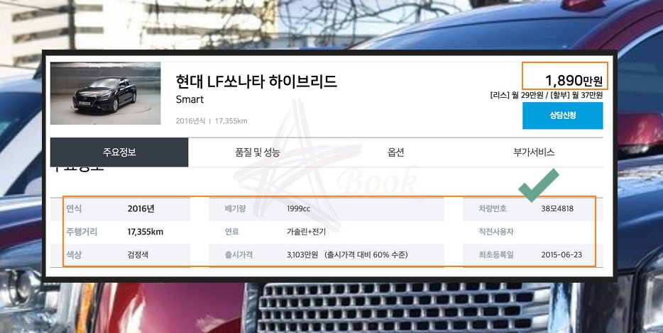 저는 전기와 가솔린으로 가는 현대 LF쏘나타 하이브리드를 선택했습니다. 표를 보면 하이브리드임에도 불구하고 가격이 꽤 저렴한 편인데요. 출시가격 대비 60% 수준입니다. 주행거리가 짧은 만큼 연식도 오래되지 않았네요.