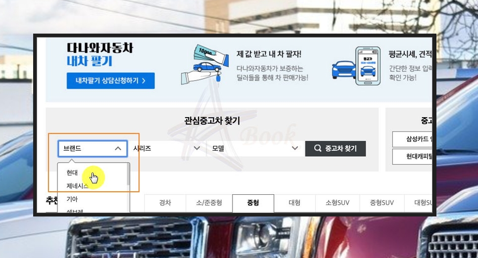 다나와 자동차 홈페이지를 이용하면 신차는 물론이고, 중고차 시세를 쉽게 찾아볼 수 있어요. 국내에서 가장 판매량이 높은 현대자동차의 모델은 물론이고, 그외 국산차와 수입차등에 대한 정보도 많습니다. 구글에서 검색한 경우에는 중고차 페이지로 바로 이동이 가능하고요. 메인 페이지로 접속한 경우에는 메뉴에 있는 중고차를 클릭해 주세요.