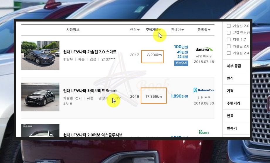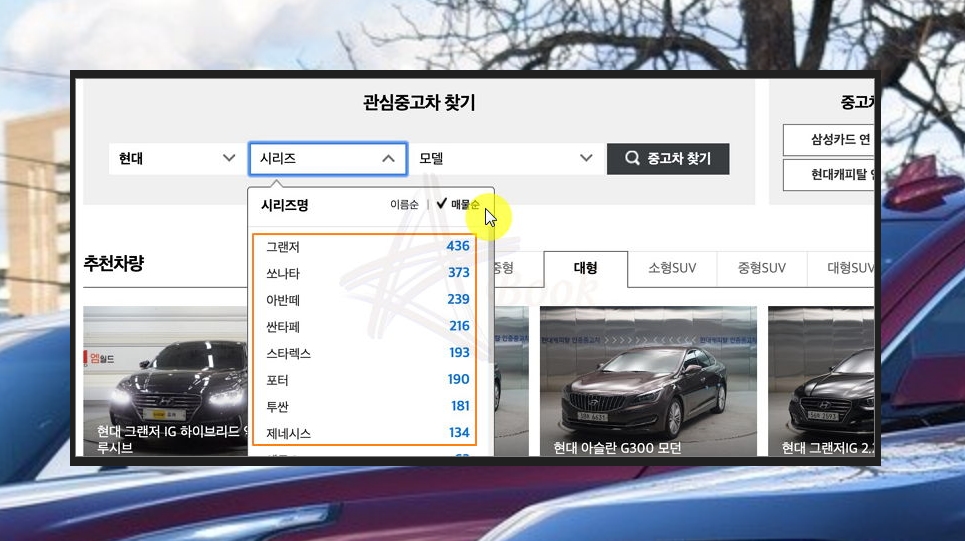 현대자동차의 경우에는 그랜저, 쏘나타, 아반떼, 싼타페, 스타렉스, 포터, 투싼, 제네시스 순으로 매물이 많네요.