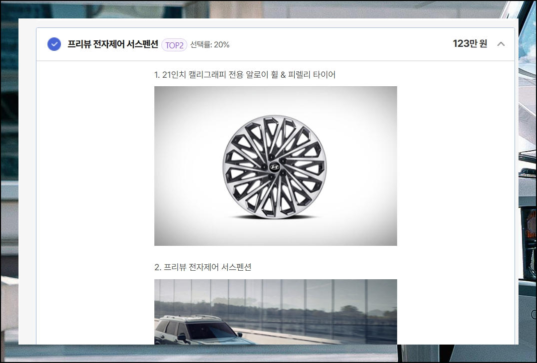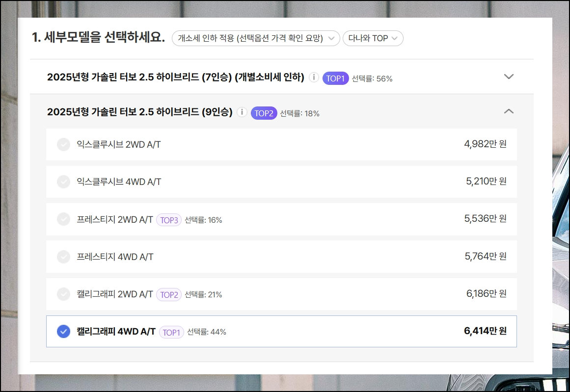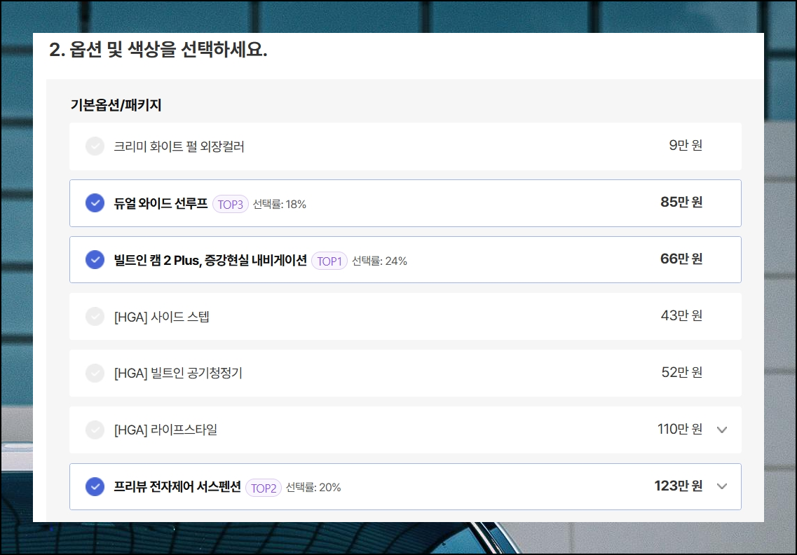 두 번째 단계인 옵션 선택은 신중하게 접근해야 해요. 신차 주문 시 선택한 옵션은 출고 후, 변경할 수 없기 때문입니다. suv 같은 경우에는 실용성과 편의성을 우선 고려해서 고르는 것이 바람직해요.