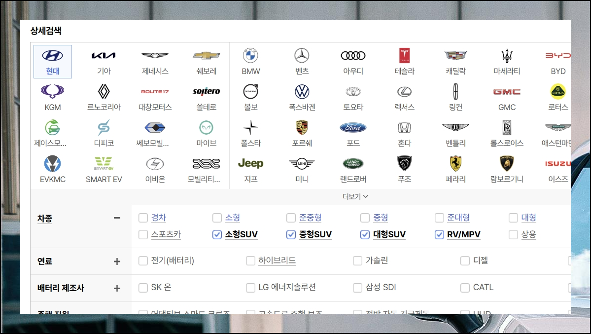 신차 검색을 클릭하면 상세 검색 화면이 나타나요. 제조사는 현대차를 선택하고, 차종에서는 suv, rv, mpv 를 체크해 주세요. 특정 크기만 관심이 있다면 소형, 중형, 대형 중에서 원하는 사이즈만 고르셔도 됩니다.