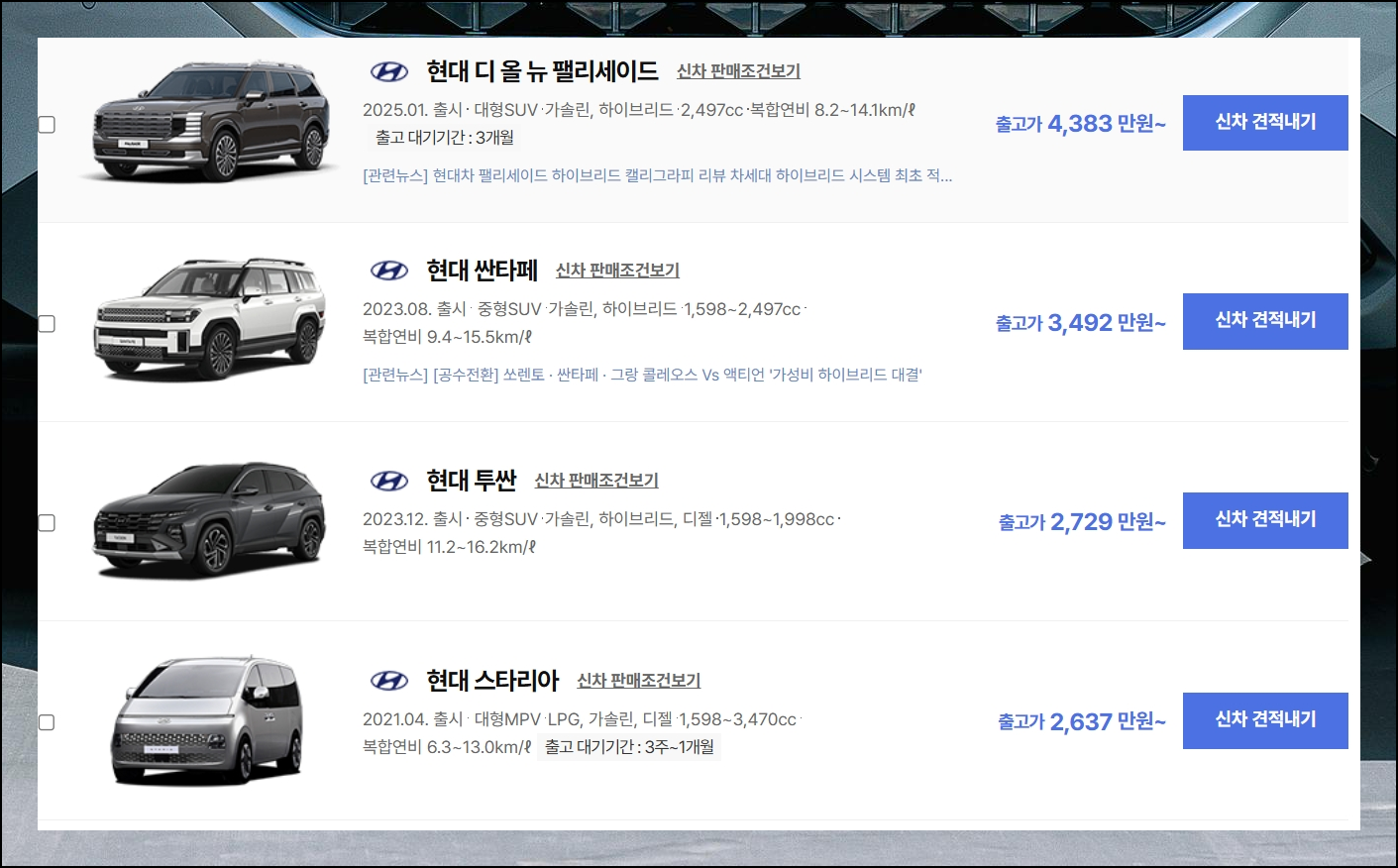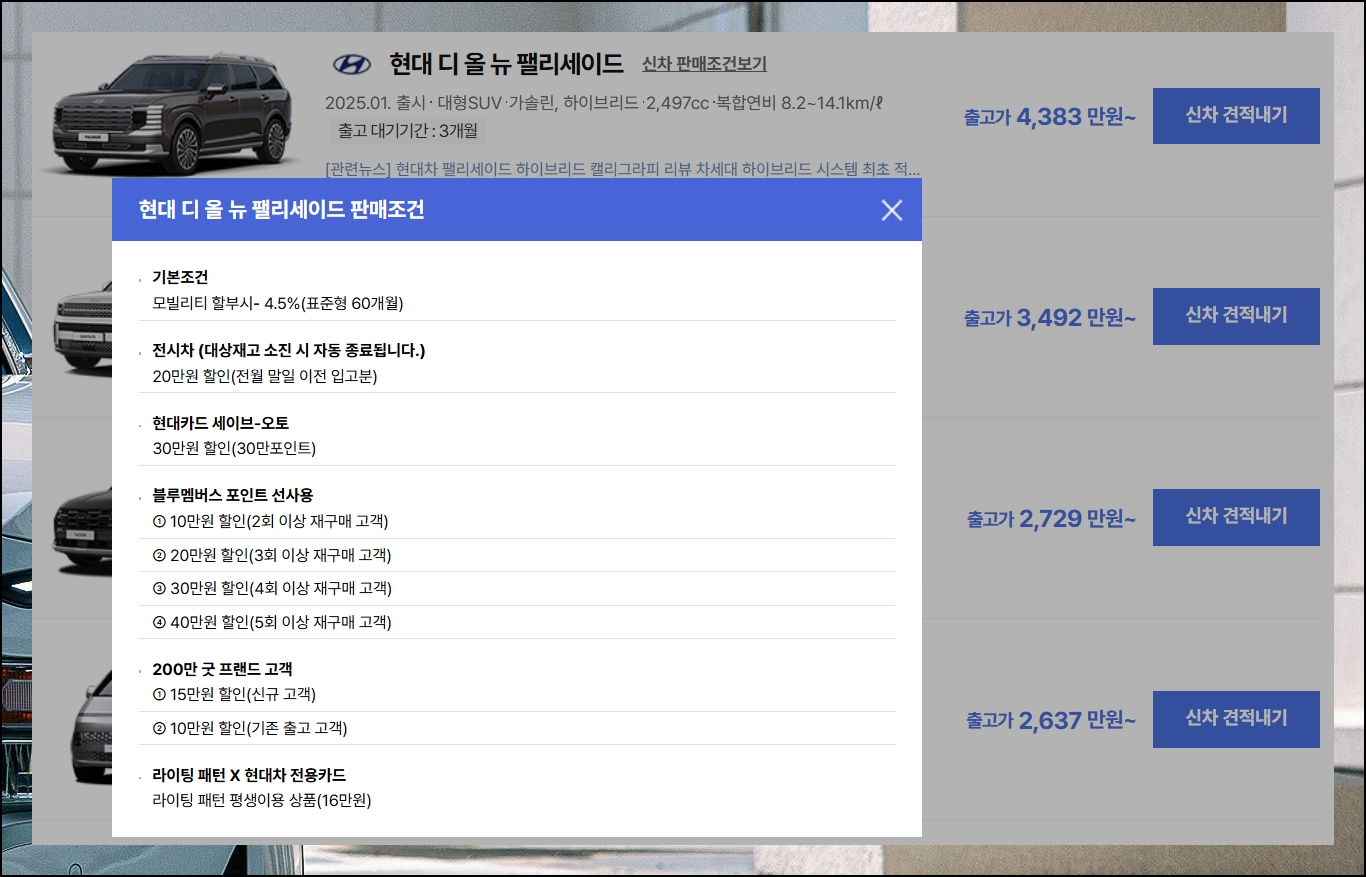검색을 실행하면 현대차의 suv 모델들이 리스트로 정리되어 나타나요. 꽤 많은 종류를 살펴볼 수 있는데요. 출시 시기순, 연비 순, 가격 순, 인기 순으로 정렬할 수 있습니다. 할인 혜택에 대한 정보가 필요하다면 더 뉴 팰리세이드에서 신차 판매조건을 확인해 보세요.