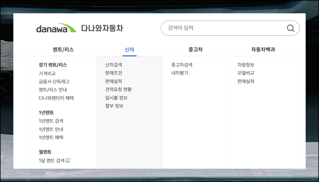 다나와 자동차 사이트에 들어가시면 상단 메뉴에서 신차 검색을 클릭해 주세요. 현대차의 신차 데이터뿐만 아니라 렌터카나 리스, 중고차 시세, 월별 판매 실적까지 제공하고 있어서 종합적인 정보 수집이 가능합니다.