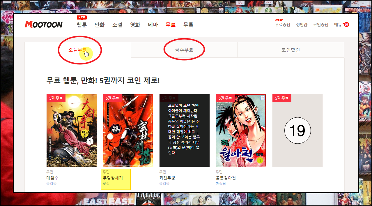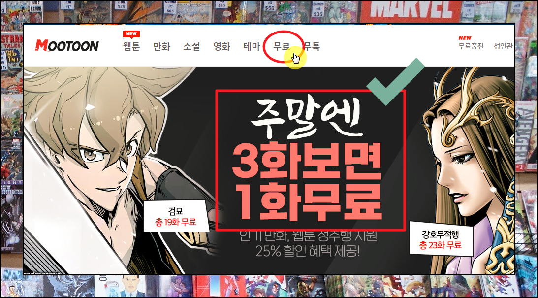 무툰 사이트에 접속했습니다. 이곳에서는 여러 가지 이벤트를 많이 하는데요. 때마침 주말에는 3화를 보면 1화를 무료로 볼 수 있다고 합니다. 무협만화와 웹툰에 대하여 진행하는 것 같습니다. 일단 황성 작가의 일부 작품을 무상으로 감상하기 위해 메뉴에 있는 [무료]를 클릭해 주세요.