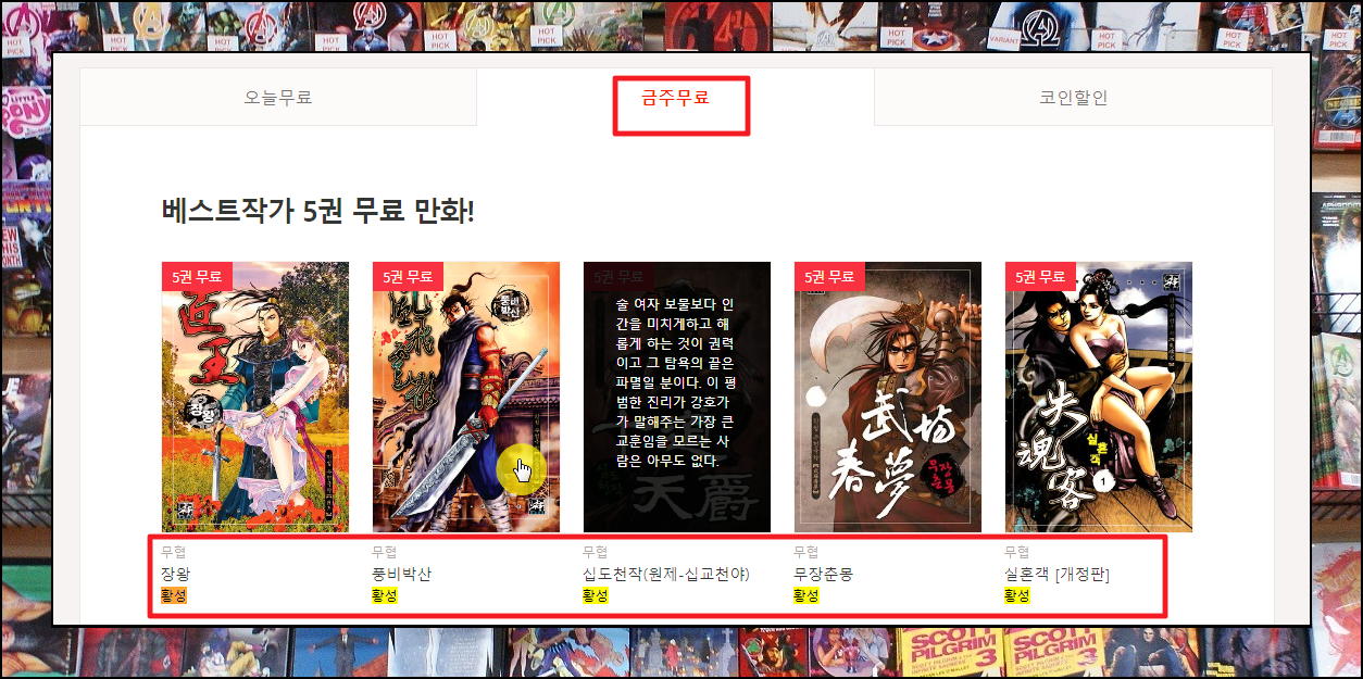 이번주에 무상으로 볼 수 있는 황성 작가의 무협만화 작품을 보려면 [금주 무료]를 선택하면 됩니다. 여기에서 감상하고 싶은 작품을 클릭해 보세요.