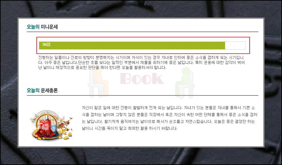90점으로 꽤 좋은 점수가 나왔습니다. 사주풀이도우미 결과를 일일이 읽기 어렵다면 이렇게 미니운세를 통해 점수만 확인하세요.