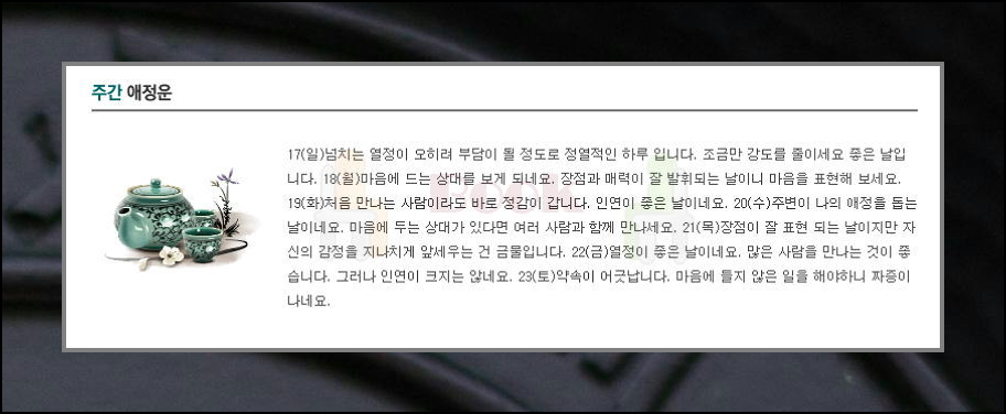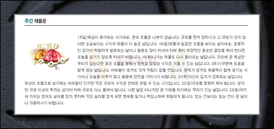 이번 주에는 무슨 일이 펼쳐질까요? 막힌 일들이 술술 풀려가기도 하고, 재물이 들어오거나 지출이 많은 시기가 있다고 하네요. 이런 식으로 주간에 무슨 일이 일어날지 예측할 수 있습니다.