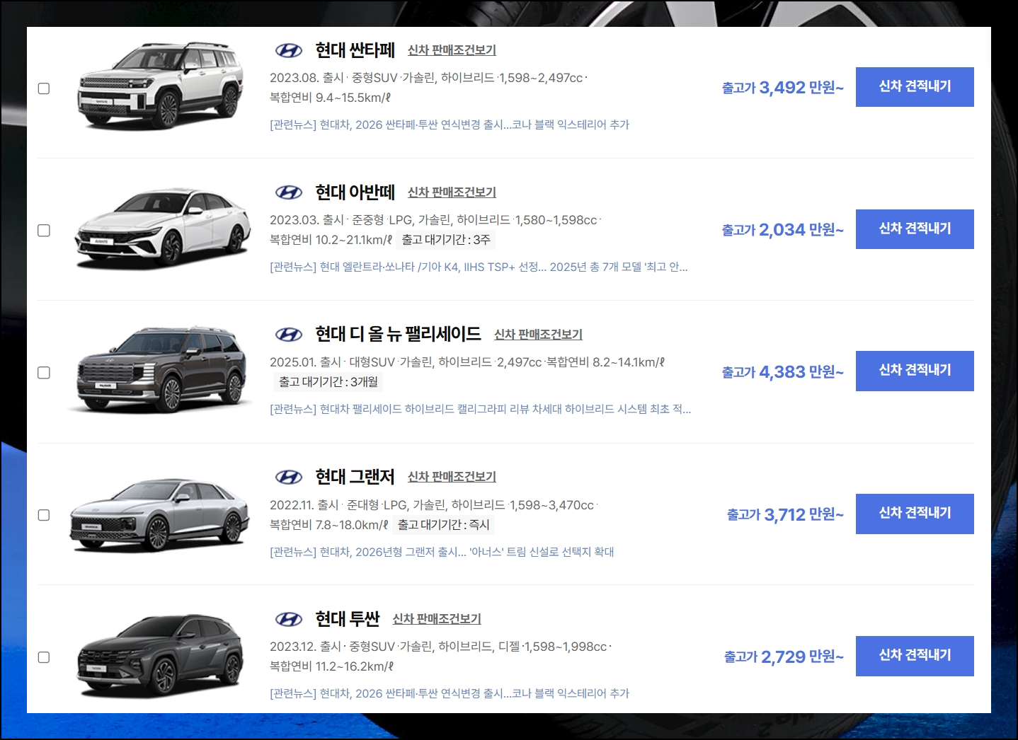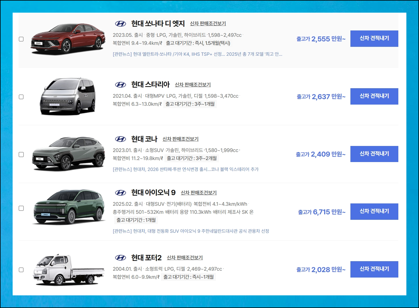 다나와 자동차 사이트의 검색 서비스를 활용해보세요. 2025 현대자동차의 상세한 금액 정보를 손쉽게 찾아볼 수 있어요. 이 플랫폼은 누구나 무료로 이용 가능한데요. 원하는 모델의 신차가격표를 빠르고 간편하게 확인할 수 있습니다.