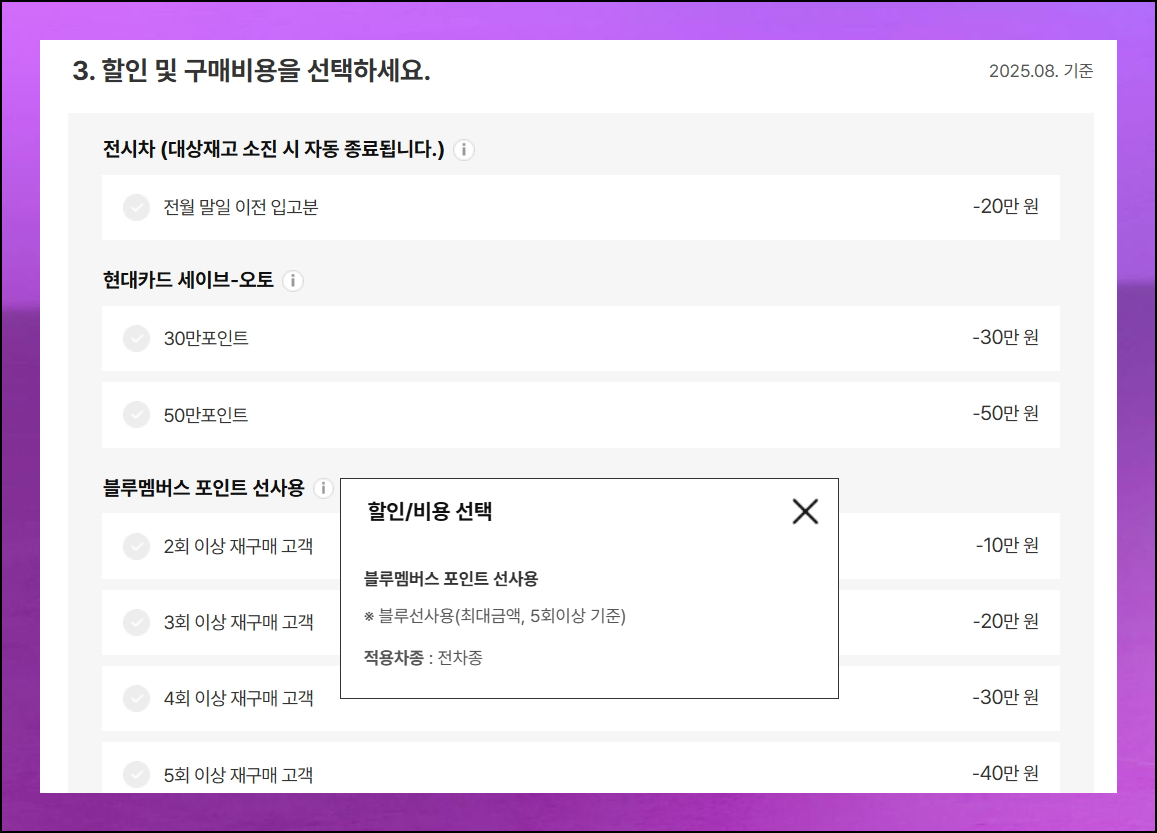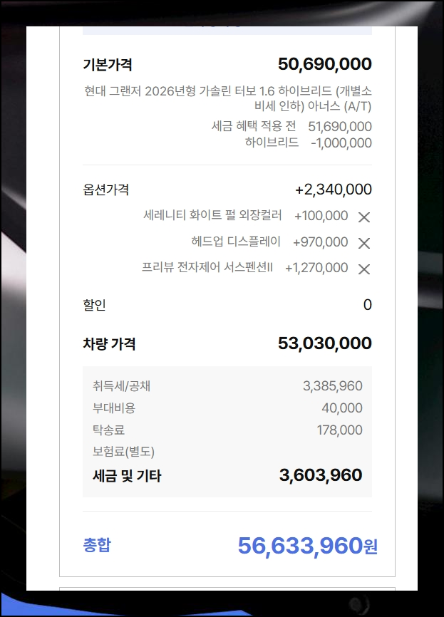 브랜드사의 판매 정책과 할인 혜택 프로그램을 꼼꼼히 살펴보면 상당한 경제적 이익을 얻을 수 있어요. 전시차 특가 판매나 기간 한정 이벤트 참여를 통한 할인 기회를 놓치지 마세요. 등록비와 탁송비 같도 선택만 하면 신차가격표에 자동으로 계산되어 반영이 됩니다.