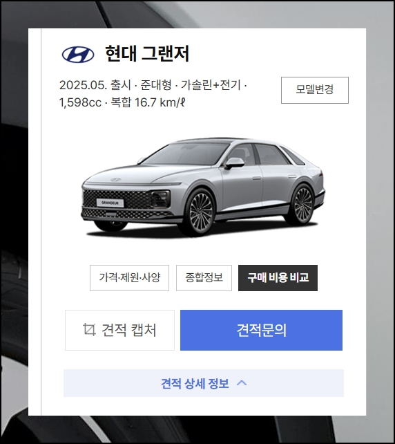 모든 선택 과정이 끝나면 완성된 신차가격표를 최종 확인할 수 있어요. 견적 캡처 기능을 사용하면 나만의 전용 견적서를 저장할 수 있습니다. 이제 2025 현대자동차 구매를 위한 모든 준비가 완료되었어요.