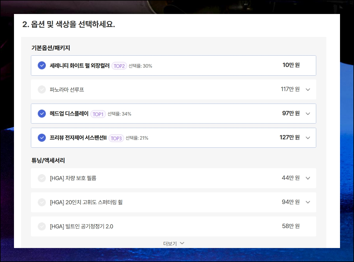 4단계의 간단한 절차를 통해 개인 맞춤형 견적을 완성할 수 있어요. 2025 신차 모델의 상세 사양을 결정하면서 추가 옵션도 선택해보세요. 다른 구매자들이 선호하는 옵션 조합 정보도 함께 참고할 수 있어서 더욱 현명한 선택에 도움이 됩니다.