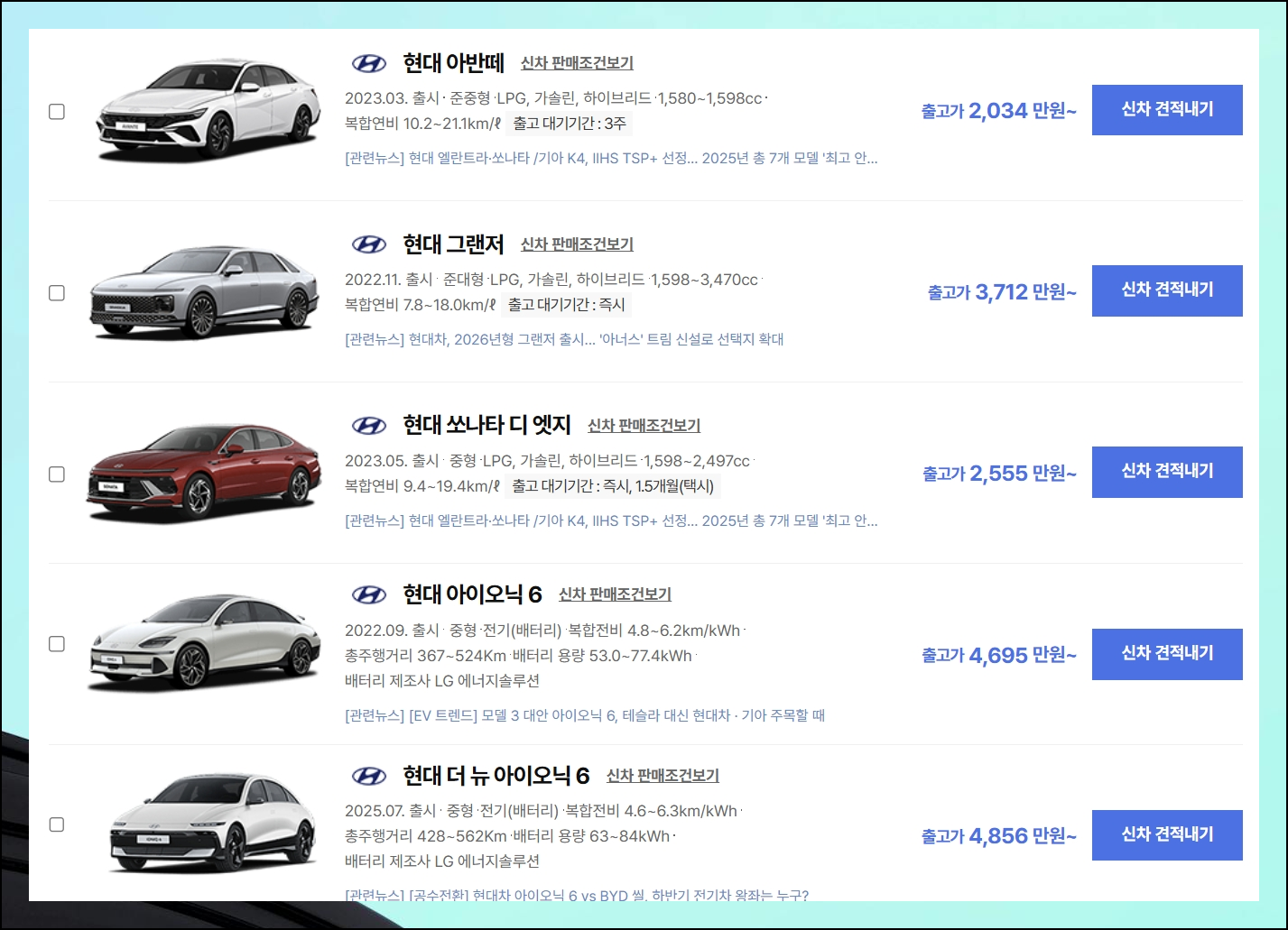 세단 계열을 중심으로 둘러보면 각 차량의 기본 스펙과 가격 범위를 한눈에 파악할 수 있습니다. 현대자동차의 신차가격표를 검토하다가 마음에 드는 모델을 발견했다면 견적내기 기능을 활용해보세요. 더욱 구체적이고 실용적인 정보를 얻을 수 있어요.