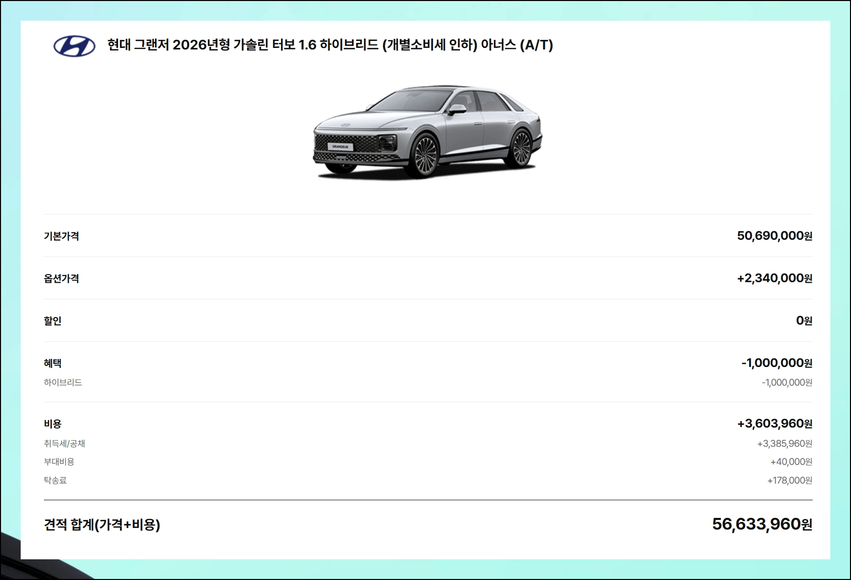 모든 선택 과정이 끝나면 완성된 신차가격표를 최종 확인할 수 있어요. 견적 캡처 기능을 사용하면 나만의 전용 견적서를 저장할 수 있습니다. 이제 2025 현대자동차 구매를 위한 모든 준비가 완료되었어요.