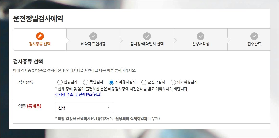 홈페이지에서 운전정밀검사예약 메뉴를 찾아 클릭하면 새 페이지가 열립니다. 해당 항목과 본인 업종을 선택하는 화면이 나타나는데요.
