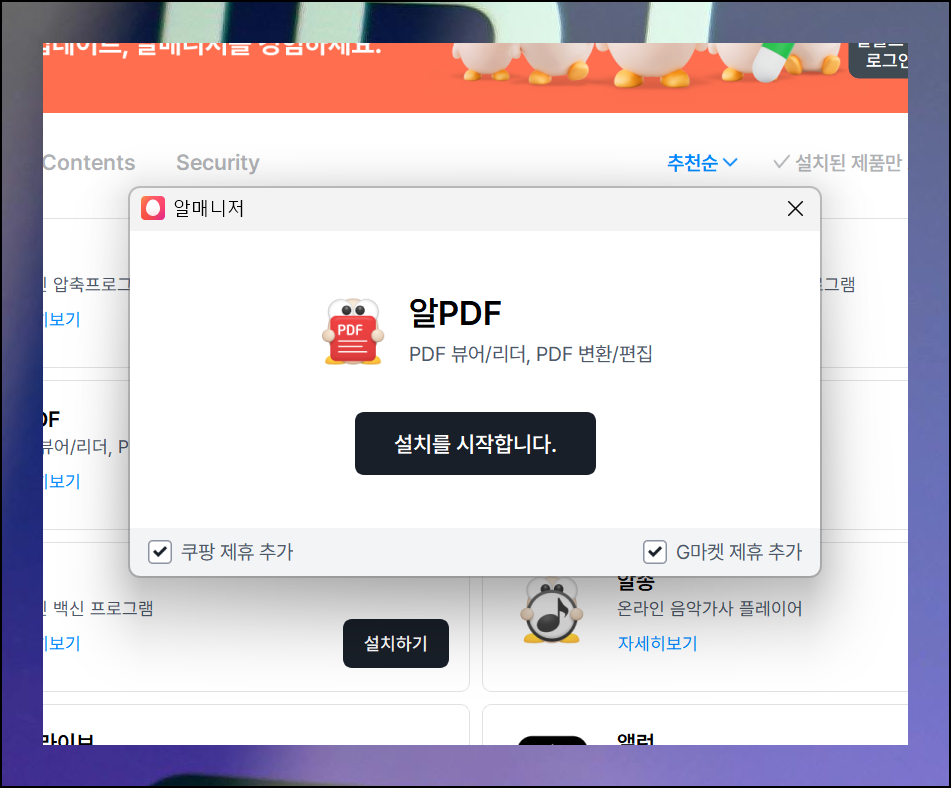 알매니저에서 설치를 시작합니다 버튼을 누를 때 하나만 주의하면 돼요. 화면 하단에 보이는 체크박스들은 부가적인 프로그램과 검색 도구 설치 여부를 묻는 거예요.