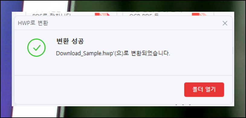 문서 지정이 끝나고 확인을 누르면 HWP 변환 진행 창이 표시되면서 처리 완료를 안내해요. 열기 옵션을 통해 즉시 완성된 한글 문서를 확인할 수 있습니다.