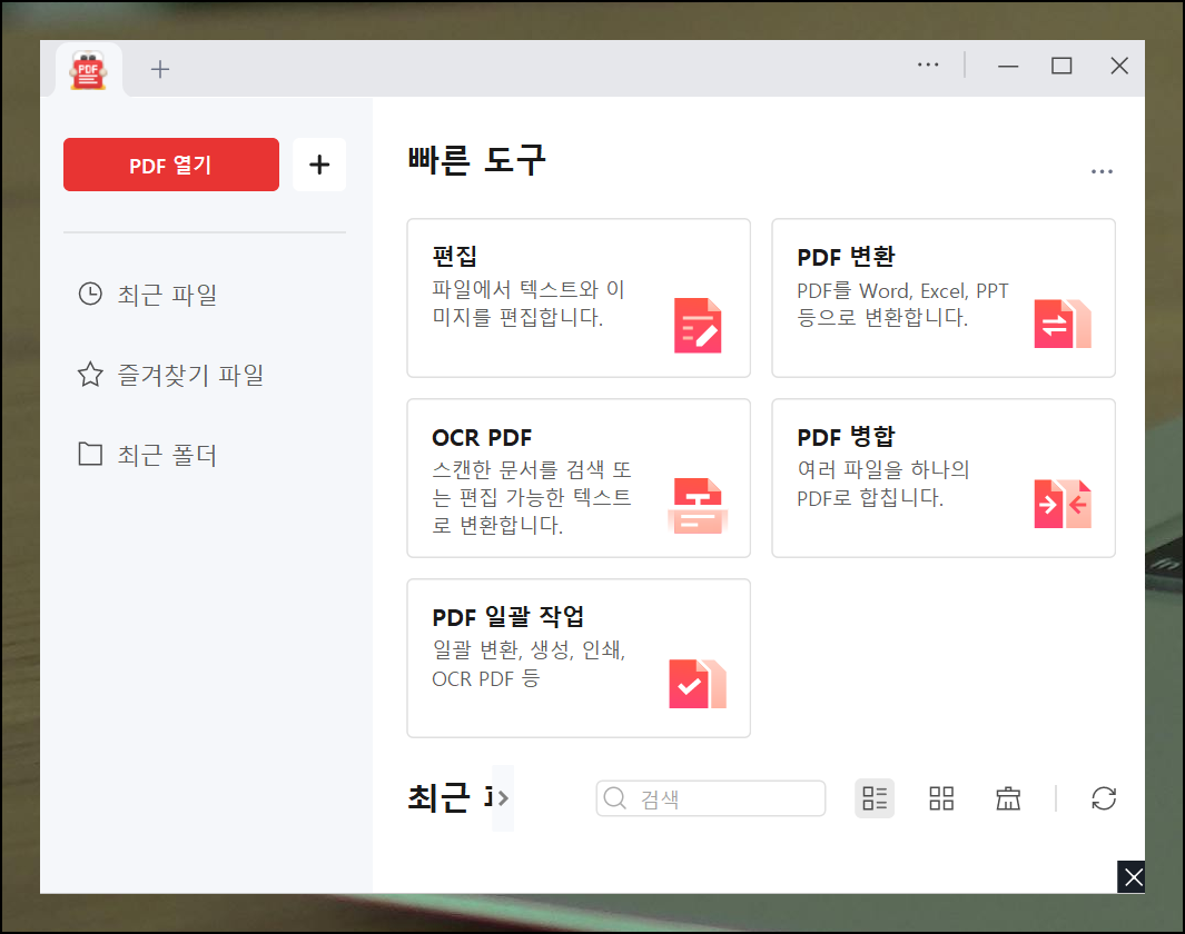 소프트웨어를 열어보면 직관적인 메인 화면이 나타나요. PDF 변환 메뉴를 클릭해서 작업을 시작하세요.