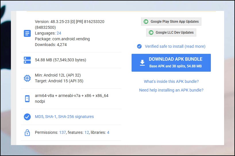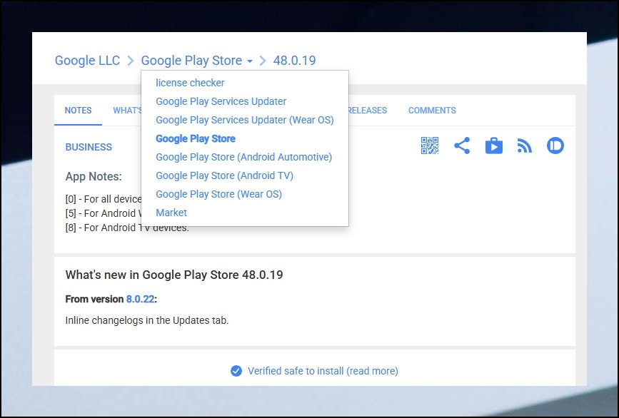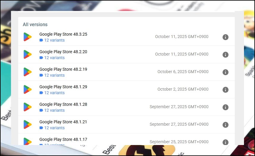 목록에서 마음에 드는 PLAY 스토어 버전을 클릭해보세요. 그러면 해당 파일에 대한 상세 정보가 화면에 표시됩니다. 다른 버전들도 살펴보고 싶으시다면 화면 왼쪽 상단에 있는 GOOGLE PLAY STORE 텍스트를 클릭하세요.