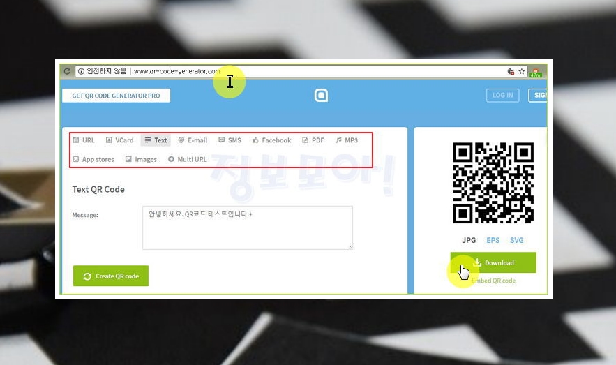 제가 알려드리는 사이트에 방문하시면 누구나 쉽게 QR코드를 만들 수 있는데요. URL, Vcard, Text, E-mail, SMS, PDF 파일 등을 넣을 수 있습니다.
