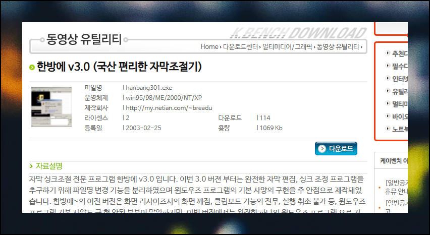 케이벤치 사이트에 접속하면 메뉴에서 [다운로드]를 선택해 보세요. 그 다음 자료실에서 원하는 프로그램을 찾는 것은 간단합니다. 그냥 '한방에'라고 검색해 주세요. 검색 결과에 smi 자막 만들기 프로그램인 '한방에'가 나타날 거예요. 이름만 봐도 한 번에 끝낼 수 있을 것 같죠? 클릭해서 상세 정보를 확인해보겠습니다.