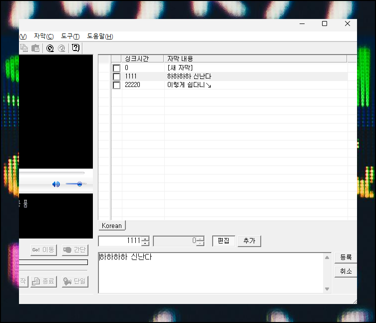 smi 파일 제작의 핵심은 우측 편집 도구를 잘 활용하는 거예요. 여기서 두 가지 핵심 정보를 넣어야 해요. 화면에 보여질 텍스트와 그 subtitle이 나타날 정확한 시간이죠. 한국어뿐만 아니라 영어로도 만들기가 가능해요.